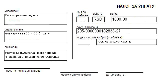 Обавештавају се сви чланови да је неопходно извршити уплату чланарине за 2014/2015 годину. Чланарина износи 1000,00 динара за редовне чланове, 500,00 динара за помажуће чланове и уплаћује се општом уплатницом или електронским налогом. Изглед опште уплатнице је дат на слици. Моле се чланови да сачувају свој примерак уплатнице. Студенти и незапослени имају право на 50% попуста за уплату чланарине. Уколико нисте сигурни који је статус вашег чланства, молимо Вас да нас контактирате путем мејла kontakt@ponjavica.org.rs или путем Фејсбук странице.